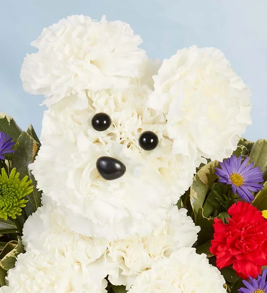 Our Party Pooch Birthday Bouquet features and adorable floral puppy made of white carnations
